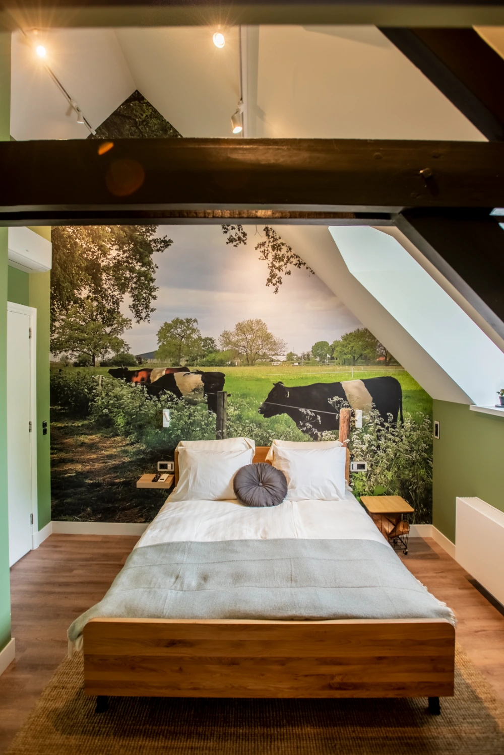 De Van Heek kamer is compact, stijlvol en van alle gemakken voorzien. Het natuurgetrouwe fotobehang geeft de ruimte een rustgevende uitstraling, alsof je midden in het groen slaapt. Perfect voor een ontspannen verblijf met z’n tweeën, binnen de historische muren van het kasteel.